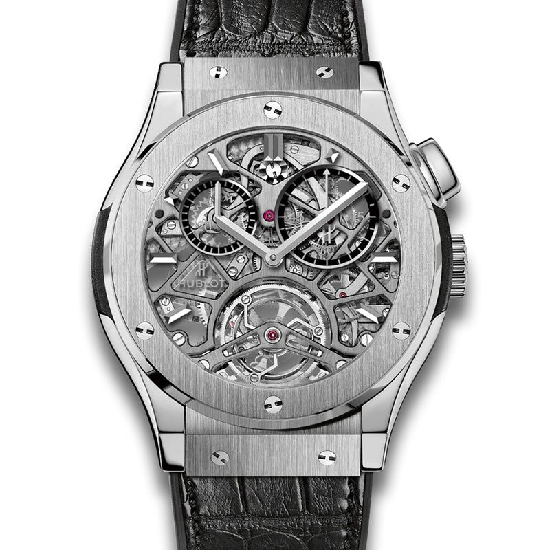 Hublot Tourbillon Skeleton Titanium Skeleton Dial Hand Wind Mens Watch 506.NX.0170.LR. Titanium case with a alligator outer / rubber inner strap. Skeleton dial with silver-tone hands and index hour markers. Luminescent hands and markers. Hand Wind movement. Scratch resistant sapphire crystal. Pull / push crown. Skeleton transparent exhibition see through case back. Case diameter: 45 mm. Round case shape. Deployment with push button clasp. Functions: hour, minute, second. Luxury watch style. Watch label: Swiss Made. Item Variations: 506 NX 0170 LR, 506-NX-0170-LR, 506/NX/0170/LR, 506NX0170LR.
