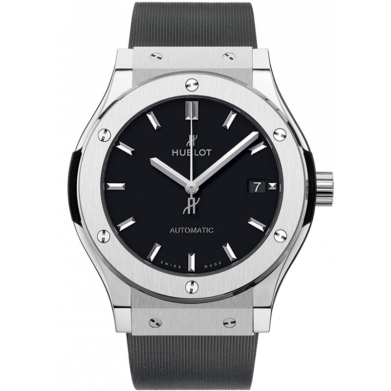 Hublot Classic Fusion Black Dial Black Rubber Mens Watch 511.NX.1171.RX. Titanium case with a black rubber strap. Fixed titanium bezel. Black dial with silver-tone hands and index hour markers. Automatic movement. Caliber hub1112 engine. Scratch resistant sapphire crystal. Screw down crown. Skeleton case back. Case diameter: 45 mm. Round case shape. Deployment clasp. Water resistant at 50 meters / 165 feet. Functions: date, hour, minute, second. Item Variations: 511NX1171RX.