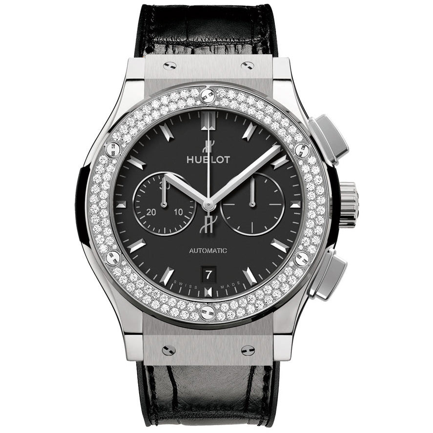 Hublot Classic Fusion Matte Black Dial Automatic Mens Watch 541.NX.1171.LR.1104. Titanium case with a alligator outer / rubber inner strap. Fixed bezel. Matte black dial with silver-tone hands and index hour markers. Minute markers around the outer rim. Chronograph - sub-dials displaying: two- 60 seconds, and 30 minutes. Automatic movement. Caliber hub1153 engine. Scratch resistant sapphire crystal. Pull / push crown. Skeleton transparent exhibition see through case back. Case diameter: 42 mm. Round case shape. Deployment with push button clasp. Water resistant at 50 meters / 165 feet. Functions: chronograph, date, hour, minute, second. Additional Info: bezel set with 138 diamonds (1.01 carats). Luxury watch.