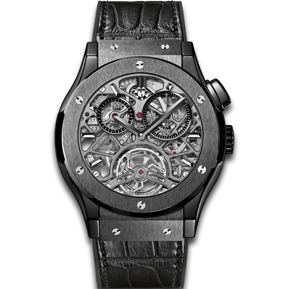 Hublot Classic Fusion Tourbillion All Black Skeleton Dial Ceramic Men's Watch 506.CM.0140.LR. Polished and satin-finished black ceramic case with a black rubber and alligator strap. Fixed - polished and satin-finished black ceramic bezel. Skeleton dial with polished black-plated hands and index hour markers. Hand wind movement. Hub6310 engine. Scratch resistant sapphire crystal. Case diameter: 45 mm. Round case shape. Deployment clasp. Functions: chronograph, hour, minute, second. Additional Info: limited edition - 99 pieces. Luxury watch. Item Variations: 506 CM 0140 LR, 506-CM-0140-LR, 506/CM/0140/LR, 506CM0140LR.