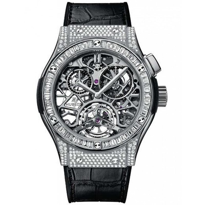 Hublot Classic Fusion Skeleton Dial Hand Wind Mens Chronograph Watch 506.NX.0170.LR.0904. Titanium case with a alligator outer / rubber inner strap. Fixed bezel. Skeleton dial with rhodium plated hands. Chronograph - sub-dials displaying: two- 60 seconds, and 30 minute. Hand Wind movement. Scratch resistant sapphire crystal. Pull / push crown. Skeleton transparent exhibition see through case back. Case diameter: 45 mm. Round case shape. Deployment with push button clasp. Water resistant at 30 meters / 100 feet. Functions: hour, minute, second, tourbillion, chronograph. Additional Info: case set with 244 diamonds for 1.30 cts, bezel set with 54 baguettes-cut diamonds for 3.02 cts.. Luxury watch.