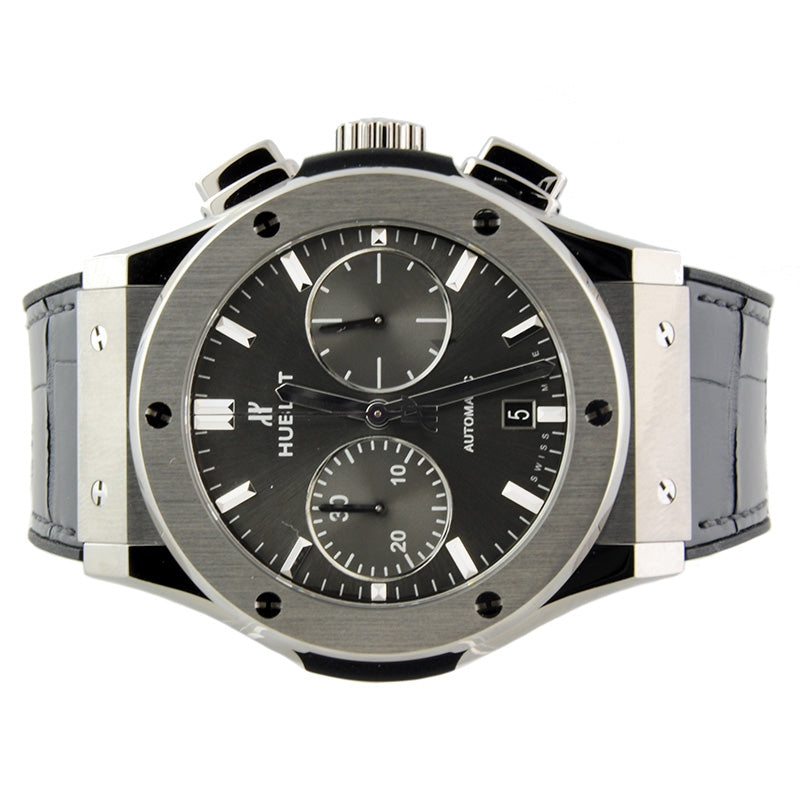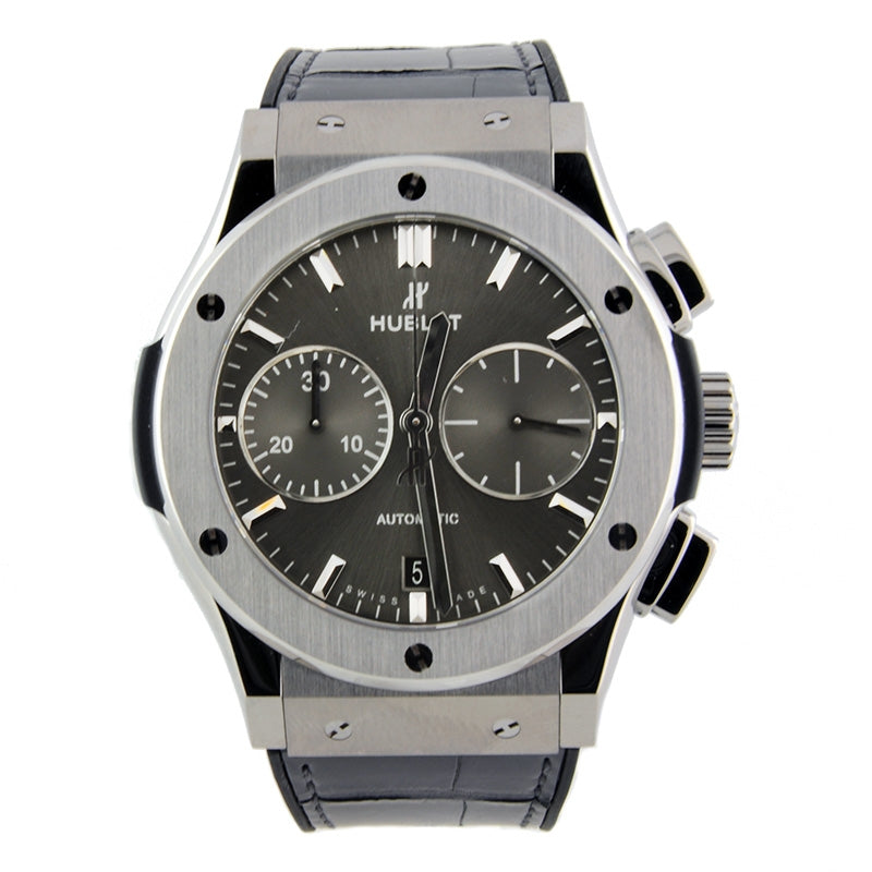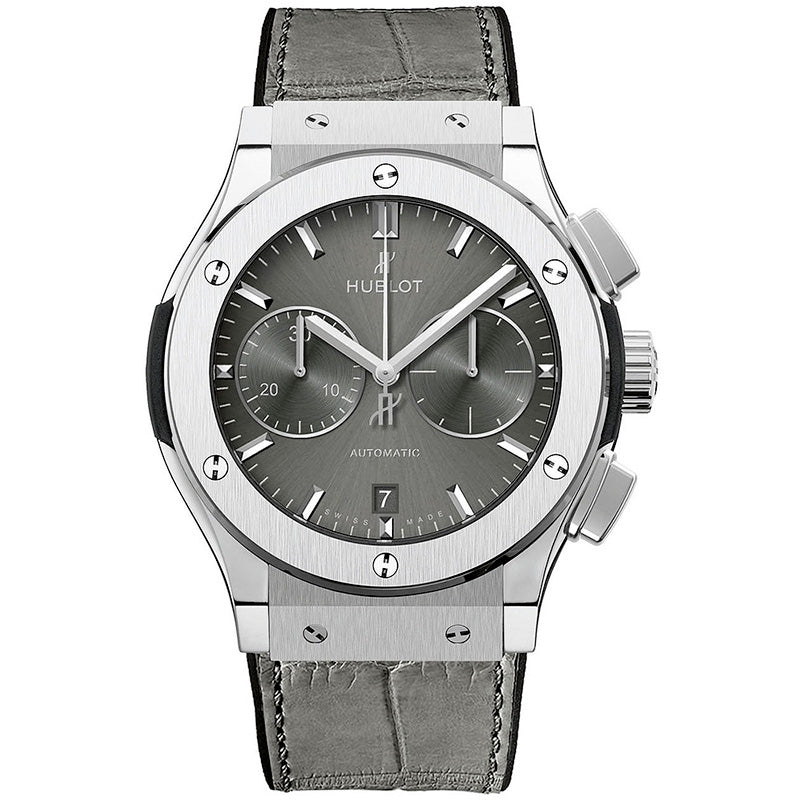 Hublot Classic Fusion Chronograph Automatic Mens Watch 521.NX.7071.LR. Titanium case with a gray alligator leather strap. Fixed bezel. Gray sunray dial with silver-tone hands and index hour markers. Chronograph - sub-dials displaying: two - 60 second and 30 minute. Hublot Calibre HUB1143 automatic movement with about 42 hours of power reserve. Scratch resistant sapphire crystal. Skeleton transparent exhibition see through case back. Case size: 45 mm. Round case shape. Water resistant at 50 meters / 165 feet.