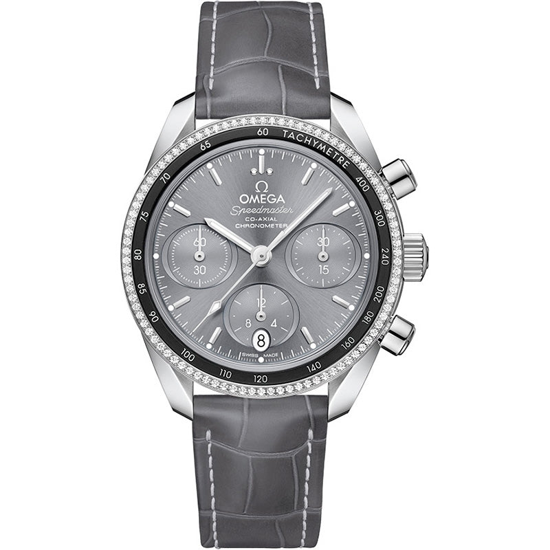 Omega Speedmaster Grey Dial Automatic Unisex Chronograph Watch 324.38.38.50.06.001. Silver-tone stainless steel case with a grey leather strap. Black aluminum bezel. Grey dial with silver-tone hands and index hour markers. Tachymeter. Omega Calibre 3330 automatic movement. Scratch resistant sapphire crystal. Transparent case back. Case size: 38 mm. Round case shape. Band width: 18 mm. Water resistant at 100 meters / 330 feet.