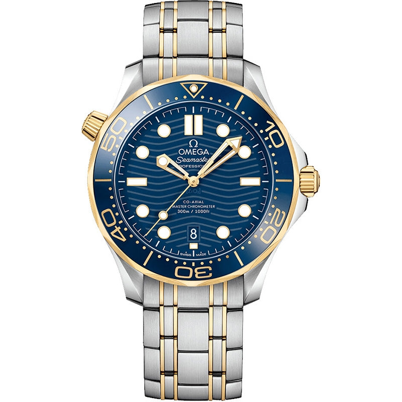 Omega 210.20.42.20.01.002 Seamaster Diver 300m Co-Axial Master Chronometer 42mm Mens Watch. Brushed stainless steel case with polished beveled corners. Polished 18kt yellow gold crowns. Helium escape valve located on the case edge at the 10 o'clock position. 18kt yellow gold with polished black ceramic fill bezel. Omega Master Co-Axial caliber 8800, beats at 25,200 vph, contains 35 jewels & has an approximate power reserve of 55 hours.