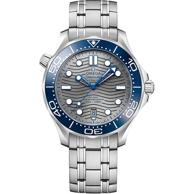 Omega 210.30.42.20.06.001 Seamaster Diver 300m Co-Axial Master Chronometer 42mm Mens Watch. Brushed stainless steel case with polished beveled corners. Polished stainless steel crowns. Helium escape valve located on the case edge at the 10 o'clock position. Omega Master Co-Axial caliber 8800, beats at 25,200 vph, contains 35 jewels & has an approximate power reserve of 55 hours.