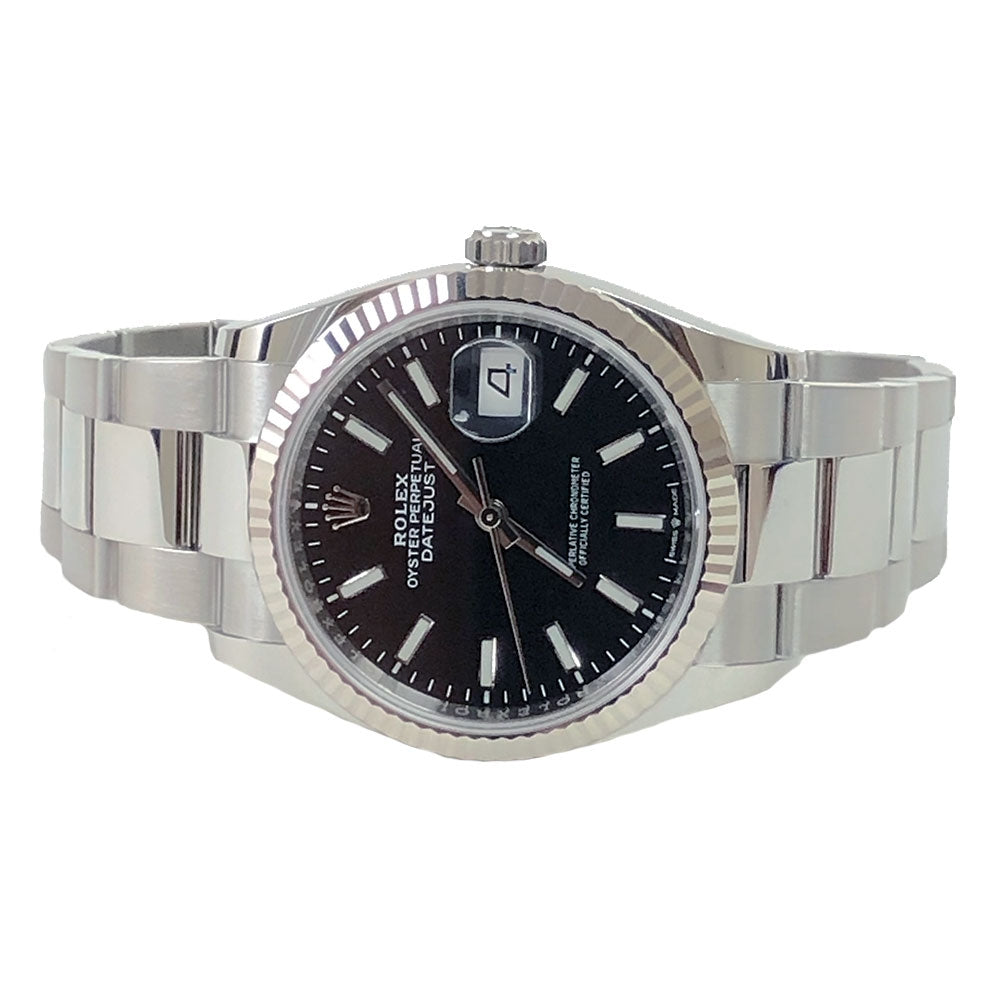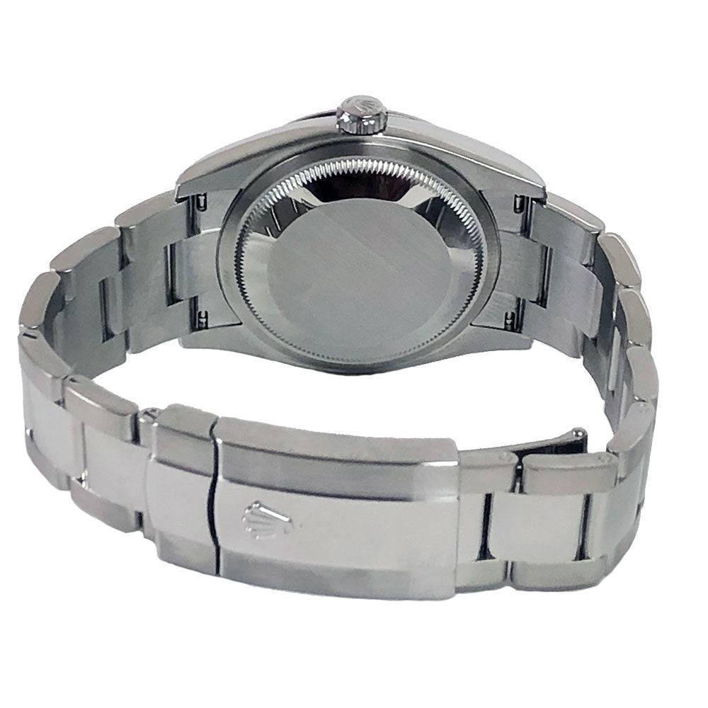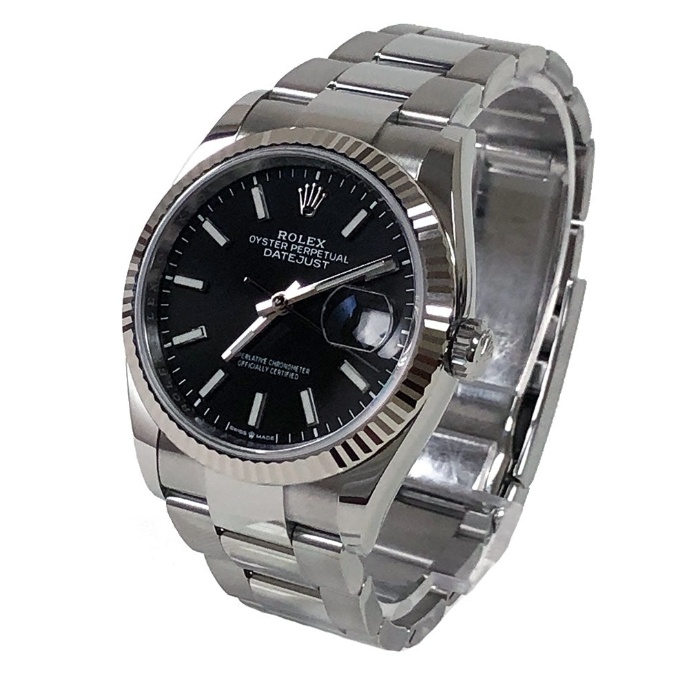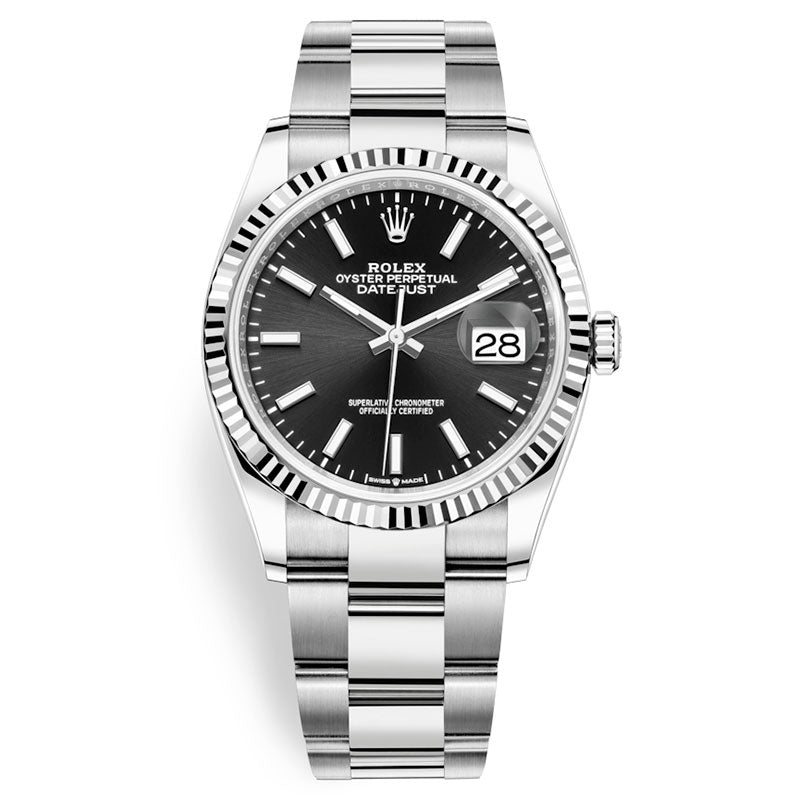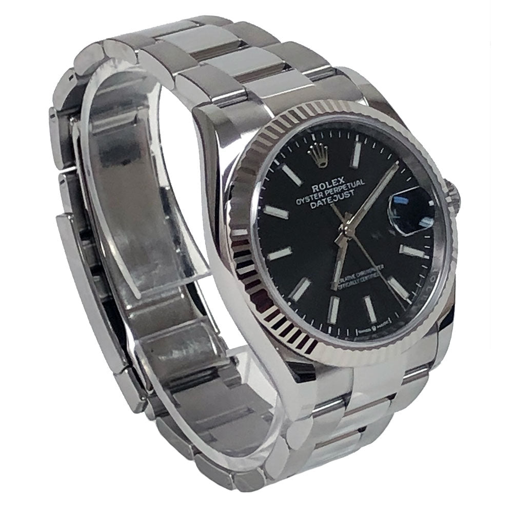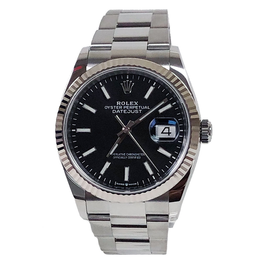Rolex 126234 blio Datejust 36mm Black Dial Oyster Bracelet Men's Watch. 36mm Oystersteel case, screw-down steel back, screw-down crown with twinlock double waterproofness system, fluted bezel, scratch-resistant sapphire crystal with cyclops lens over the date, blue dial, index hour markers, Rolex calibre 3235 perpetual self-winding movement with center hour, minute and seconds hands, instantaneous date at 3 o'clock with rapid setting, and stop-seconds for precise time setting, approximately 70 hours of power reserve, Waterproof to 100 meters. Baselworld 2019 release.