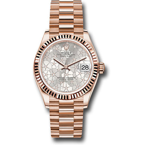Rolex 278275 sflomdp Everose Gold Datejust 21 Watch. The 31mm watch showcases an exquisite 18kt Everose gold case with a screw-down back and a screw-down crown featuring the twinlock double waterproofness system for enhanced water resistance. The fluted bezel adds a touch of elegance to the design. The scratch-resistant sapphire crystal includes a cyclops lens over the date window at 3 o'clock for easy reading of the date. The silver floral motif dial is adorned with 24 diamonds, adding a luxurious and feminine touch to the timepiece. Powering the watch is the Rolex Calibre 2236 perpetual self-winding movement, which features center hour, minute, and seconds hands, instantaneous date with rapid setting, and stop-seconds for precise time setting. The watch offers approximately 55 hours of power reserve for reliable performance. Completing the luxurious look is the President bracelet with semi-circular three-piece links, adding comfort and sophistication to the overall design. This watch is a stunning combination of beauty, precision, and craftsmanship.