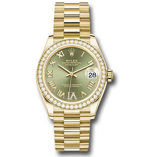 Rolex 278288rbr ogflomdp Oyster Perpetual Datejust Ladies Watch. 31mm 18K yellow gold case, screw-down back, screw-down crown with twinlock double waterproofness system, diamond bezel, scratch-resistant sapphire crystal with cyclops lens over the date, olive green floral motif dial set with 24 diamonds, Rolex calibre 2236 perpetual self-winding movement with centre hour, minute and seconds hands, instantaneous date with rapid setting, and stop-seconds for precise time setting, approximately 55 hours of power reserve, President bracelet with semi-circular three-piece links, concealed folding Crownclasp buckle.