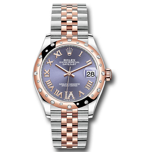 Rolex 278341RBR aubdr6j Oyster Perpetual Datejust Ladies Watch. 31mm stainless steel case, 18K pink gold domed bezel set with 24 diamonds, purple diamond Roman VI dial, Roman numerals with 11 diamonds set on VI, and stainless steel and 18K pink gold Jubilee bracelet.