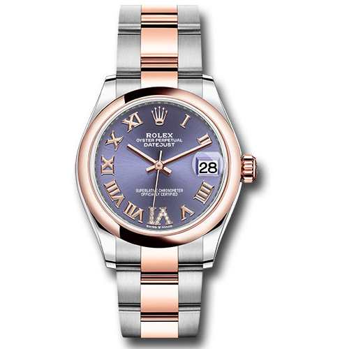 Rolex 278241 aubdr6o chdro Oyster Perpetual Datejust Watch. 31mm Everose Rolesor case comprised of Oystersteel and 18K Everose gold, screw-down back, screw-down crown with twinlock double waterproofness system, 18K Everose gold domed bezel, scratch-resistant sapphire crystal with cyclops lens over the date, aubergine dial, Roman numerals with diamond set 6, Rolex calibre 2236 perpetual self-winding movement with date at 3 o'clock, approximately 55 hours of power reserve, Eversose Rolesor Oyster bracelet made from a combination of steel and 18K everose gold with flat three-piece links, folding Oysterclasp buckle with Easylink 5mm comfort extension link