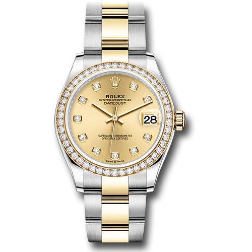Rolex Datejust Champaign Dial Automatic Stainless Steel and 18kt Gold Ladies Watch 278383RBR chdo. Datejust Lady 31 Champaign Dial Stainless Steel and 18K Yellow Gold Oyster Bracelet Automatic Watch. 31mm yellow Rolesor case comprised of Oystersteel and 18K yellow gold, screw-down back, screw-down crown with twinlock double waterproofness system, 18K yellow gold bezel set with diamonds, scratch-resistant sapphire crystal with cyclops lens over the date, champagne dial, diamond hour markers, Rolex calibre 2236 perpetual self-winding movement with date at 3 o'clock, approximately 55 hours of power reserve, yellow Rolesor Oyster bracelet made from a combination of 904L steel and 18K yellow gold with flat three-piece links, folding Oysterclasp buckle with Easylink 5mm comfort extension link. Waterproof to 100 meters. Baselworld 2019 release.