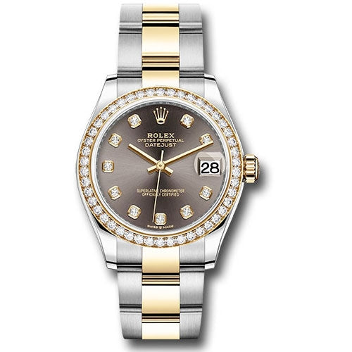 Rolex Datejust Dark Gray Dial Automatic Stainless Steel and 18kt Gold Ladies Watch 278383RBR dkgdo. 31mm yellow Rolesor case comprised of Oystersteel and 18K yellow gold, screw-down back, screw-down crown with twinlock double waterproofness system, 18K yellow gold bezel set with diamonds, scratch-resistant sapphire crystal with cyclops lens over the date, dark grey dial, diamond hour markers, Rolex calibre 2236 perpetual self-winding movement with date at 3 o'clock, approximately 55 hours of power reserve, yellow Rolesor Oyster bracelet made from a combination of 904L steel and 18K yellow gold with flat three-piece links, folding Oysterclasp buckle with Easylink 5mm comfort extension link. Waterproof to 100 meters. Baselworld 2019 release.