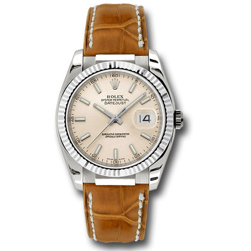 Rolex 116139 psb Oyster Perpetual Datejust Watch. 36mm 18kt white gold case, fluted bezel, pink dial, stick hour markers, and brown leather strap with 18kt white gold deployable clasp.