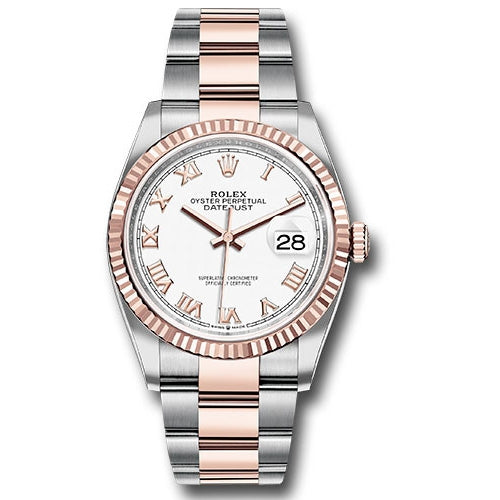 Rolex 126231 wro Oyster Perpetual Datejust 36 Watch. 36mm Everose Rolesor case with Oystersteel monobloc middle case, screw-down steel back, screw-down 18K Everose crown, 18K Everose fluted bezel, white dial, Roman numerals, Rolex calibre 3235 self-winding movement with date at 3 o'clock, approximately 70 hours of power reserve, Everose Rolesor Oyster bracelet with flat three-piece links, folding Oysterclasp buckle with Easylink 5mm comfort extension link. Waterproof to 100 meters. Redesigned for Baselworld 2018 with updated case sides, lugs, and calibre 3235 movement.