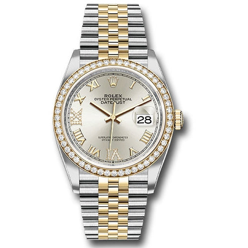 Rolex 126283RBR sdr69j Oyster Perpetual Datejust 36 Watch. 36mm yellow Rolesor case with Oystersteel monobloc middle case, screw-down steel back, screw-down 18K yellow crown, 18K yellow diamond bezel, silver dial, Roman numerals with diamond set 6 and 9, Rolex calibre 3235 self-winding movement with date at 3 o'clock, approximately 70 hours of power reserve, yellow Rolesor Jubilee bracelet with five-piece links, folding Oysterclasp buckle with Easylink 5mm comfort extension link. Waterproof to 100 meters. Redesigned for Baselworld 2018 with updated case sides, lugs, and calibre 3235 movement.