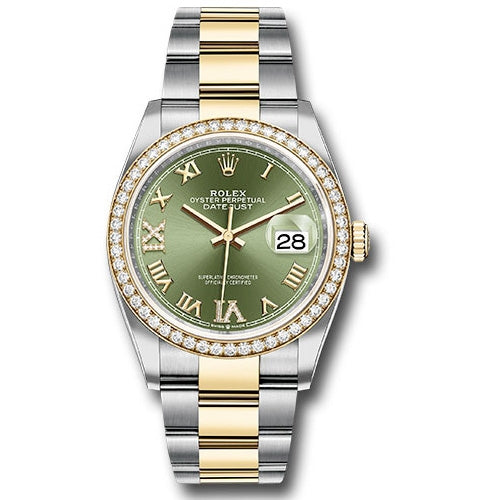 Rolex 126283RBR ogdr69o Oyster Perpetual Datejust 36 Watch. 36mm yellow Rolesor case with Oystersteel monobloc middle case, screw-down steel back, screw-down 18K yellow crown, 18K yellow diamond bezel, olive green dial, Roman numerals with diamond set 6 and 9, Rolex calibre 3235 self-winding movement with date at 3 o'clock, approximately 70 hours of power reserve, yellow Rolesor Oyster bracelet with flat three-piece links, folding Oysterclasp buckle with Easylink 5mm comfort extension link. Waterproof to 100 meters. Redesigned for Baselworld 2018 with updated case sides, lugs, and calibre 3235 movement.