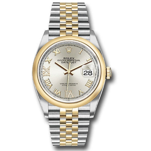 Rolex 126203 sdr69j Oyster Perpetual Datejust 36 Watch. 36mm yellow Rolesor case with Oystersteel monobloc middle case, screw-down steel back, screw-down 18K yellow crown, 18K yellow domed bezel, silver dial, Roman numerals with diamond set 6 and 9, Rolex calibre 3235 self-winding movement with date at 3 o'clock, approximately 70 hours of power reserve, yellow Rolesor Jubilee bracelet with five-piece links, folding Oysterclasp buckle with Easylink 5mm comfort extension link. Waterproof to 100 meters. Redesigned for Baselworld 2018 with updated case sides, lugs, and calibre 3235 movement.