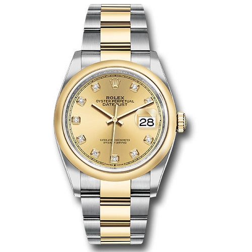 Rolex 126203 chdo Oyster Perpetual Datejust 36 Watch. 36mm yellow Rolesor case with Oystersteel monobloc middle case, screw-down steel back, screw-down 18K yellow crown, 18K yellow domed bezel, champagne dial, 10 diamond hour markers, Rolex calibre 3235 self-winding movement with date at 3 o'clock, approximately 70 hours of power reserve, yellow Rolesor Oyster bracelet with flat three-piece links, folding Oysterclasp buckle with Easylink 5mm comfort extension link. Waterproof to 100 meters. Redesigned for Baselworld 2018 with updated case sides, lugs, and calibre 3235 movement.