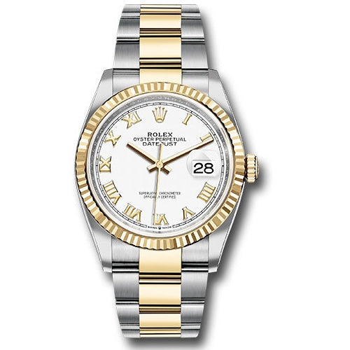 Rolex 126233 wro Oyster Perpetual Datejust 36 Watch. 36mm yellow Rolesor case with Oystersteel monobloc middle case, screw-down steel back, screw-down 18K yellow crown, 18K yellow fluted bezel, white dial, Roman numerals, Rolex calibre 3235 self-winding movement with date at 3 o'clock, approximately 70 hours of power reserve, yellow Rolesor Oyster bracelet with flat three-piece links, folding Oysterclasp buckle with Easylink 5mm comfort extension link. Waterproof to 100 meters. Redesigned for Baselworld 2018 with updated case sides, lugs, and calibre 3235 movement.