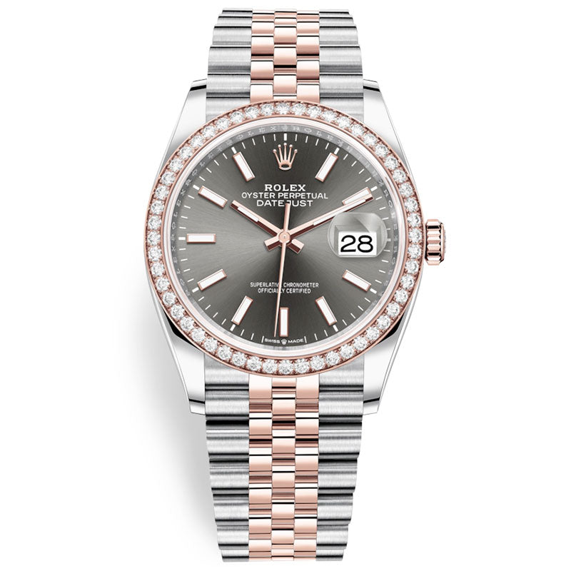 Rolex 126281RBR dkrij Datejust 36mm Steel & 18kt Rose Gold Men's Watch. 36mm Everose Rolesor case with Oystersteel monobloc middle case, screw-down steel back, screw-down 18K Everose crown, 18K Everose diamond bezel, dark rhodium dial, index hour markers with Chromalight, Rolex calibre 3235 self-winding movement with date at 3 o'clock, approximately 70 hours of power reserve, Everose Rolesor Jubilee bracelet with five-piece links, folding Oysterclasp buckle with Easylink 5mm comfort extension link. Waterproof to 100 meters. Redesigned for Baselworld 2018 with updated case sides, lugs, and calibre 3235 movement. Product Variation: 126281RBR-0001.