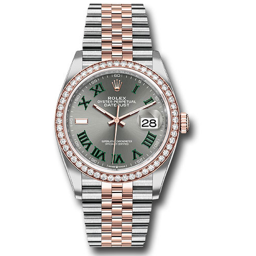 Rolex 126281RBR slgrj Datejust 36mm Everose Rolesor case comprised of Oystersteel and Everose gold, screw-down back, screw-down crown with twinlock double waterproofness system, diamond bezel, scratch-resistant sapphire crystal with cyclops lens over the date, slate dial, green Roman numerals, Rolex calibre 3235 perpetual self-winding movement with centre hour, minute and seconds hands, instantaneous date with rapid setting, and stop-seconds for precise time setting, approximately 70 hours of power reserve, Jubilee bracelet with five-piece links, folding Oysterclasp buckle with Easylink 5mm comfort extension link.