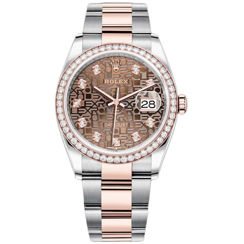 Rolex 126281RBR chojdo Datejust 36mm Steel & 18kt Rose Gold Men's Watch. 36mm Everose Rolesor case with Oystersteel monobloc middle case, screw-down steel back, screw-down 18K Everose crown, 18K Everose diamond bezel, chocolate Jubilee dial, 10 diamond hour markers, Rolex calibre 3235 self-winding movement with date at 3 o'clock, approximately 70 hours of power reserve, Everose Rolesor Oyster bracelet with flat three-piece links, folding Oysterclasp buckle with Easylink 5mm comfort extension link. Waterproof to 100 meters. Redesigned for Baselworld 2018 with updated case sides, lugs, and calibre 3235 movement. Item variation: 126281rbr-0014.