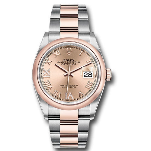 Rolex 126201 rdr69o 36mm Everose Rolesor case with Oystersteel monobloc middle case, screw-down steel back, screw-down 18K Everose crown, 18K Everose domed bezel, rose dial, Roman numerals with diamond set 6 and 9, Rolex calibre 3235 self-winding movement with date at 3 o'clock, approximately 70 hours of power reserve, Everose Rolesor Oyster bracelet with flat three-piece links, folding Oysterclasp buckle with Easylink 5mm comfort extension link. Waterproof to 100 meters. Redesigned for Baselworld 2018 with updated case.