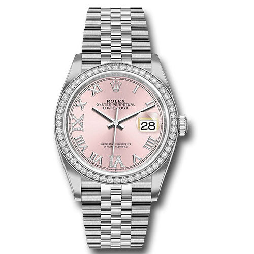 Rolex 126284RBR pdr69j Datejust 36mm Steel & White Gold Mens Watch. 36mm Oystersteel case, screw-down steel back, screw-down crown with twinlock double waterproofness system, diamond bezel, scratch-resistant sapphire crystal with cyclops lens over the date, pink dial, Roman numerals with diamond set 6 and 9, Rolex calibre 3235 perpetual self-winding movement with center hour, minute and seconds hands, instantaneous date at 3 o'clock with rapid setting, and stop-seconds for precise time setting, approximately 70 hours of power reserve, Jubilee bracelet with five-piece links, folding Oysterclasp buckle with Easylink 5mm comfort extension link. Waterproof to 100 meters. Baselworld 2019 release.