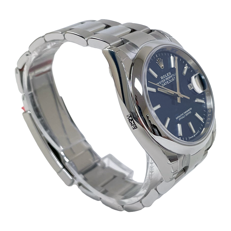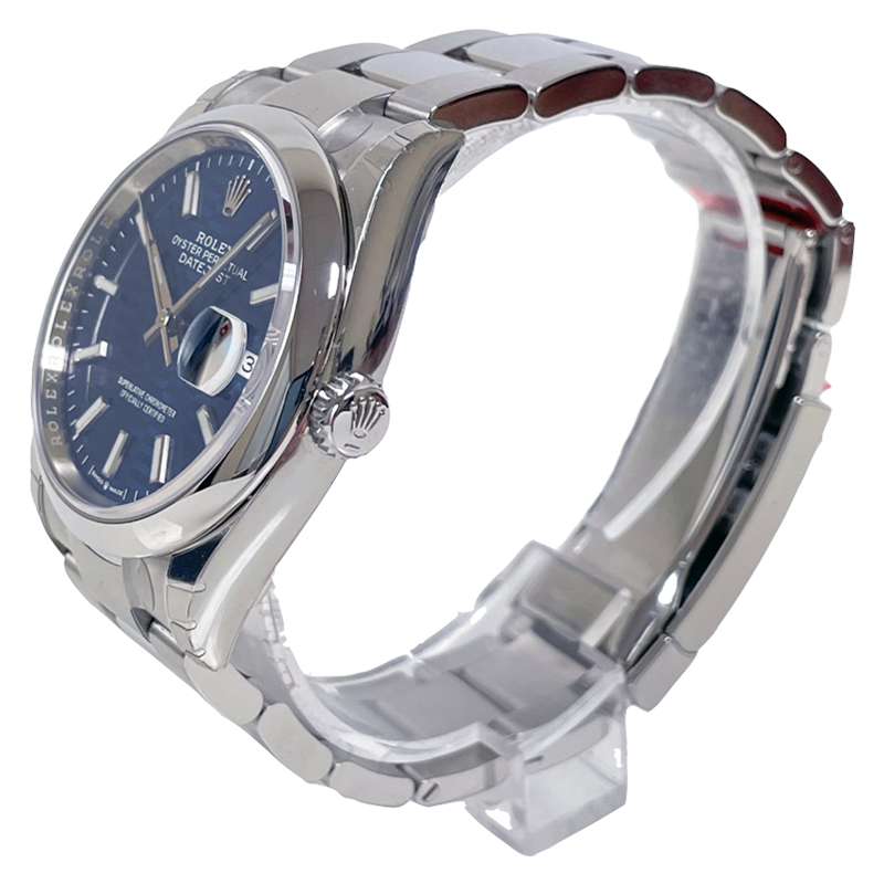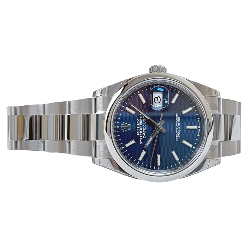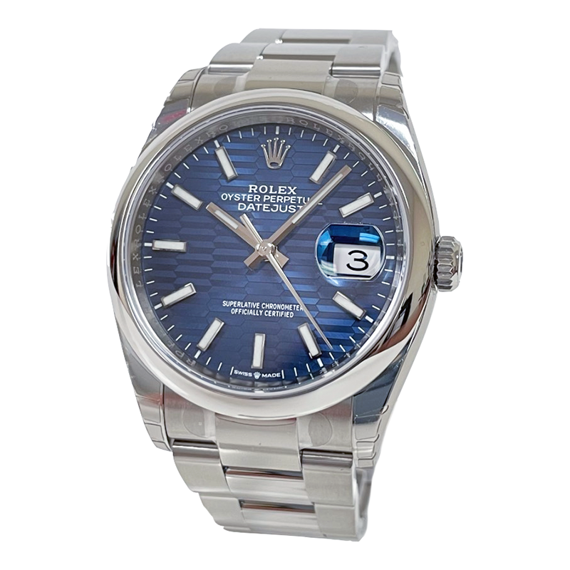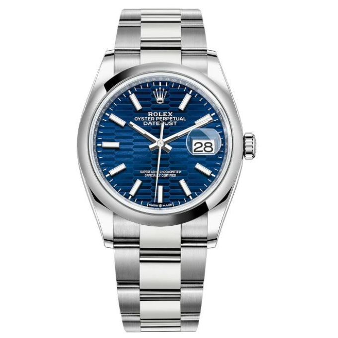 Rolex Datejust 36 Automatic Blue fluted motif Dial Mens Oyster Watch 126200BLIOFM. Silver-tone stainless steel case with a silver-tone stainless steel rolex oyster bracelet. Fixed- domed silver-tone bezel. Blue dial with silver-tone hands and index hour markers. Minute markers around the outer rim. Rolex Calibre 3235 automatic movement with a 70-hour power reserve. Scratch resistant sapphire crystal. Screw down crown. Solid case back. Round case shape. Case size: 36 mm. Oyster clasp. Water resistant at 100 meters / 330 feet.
