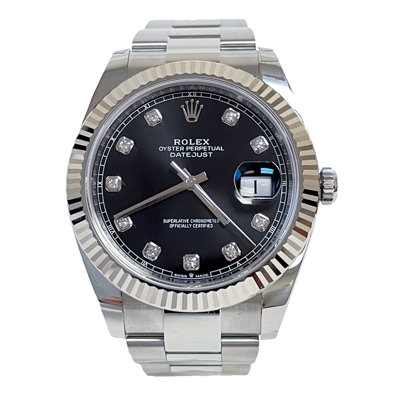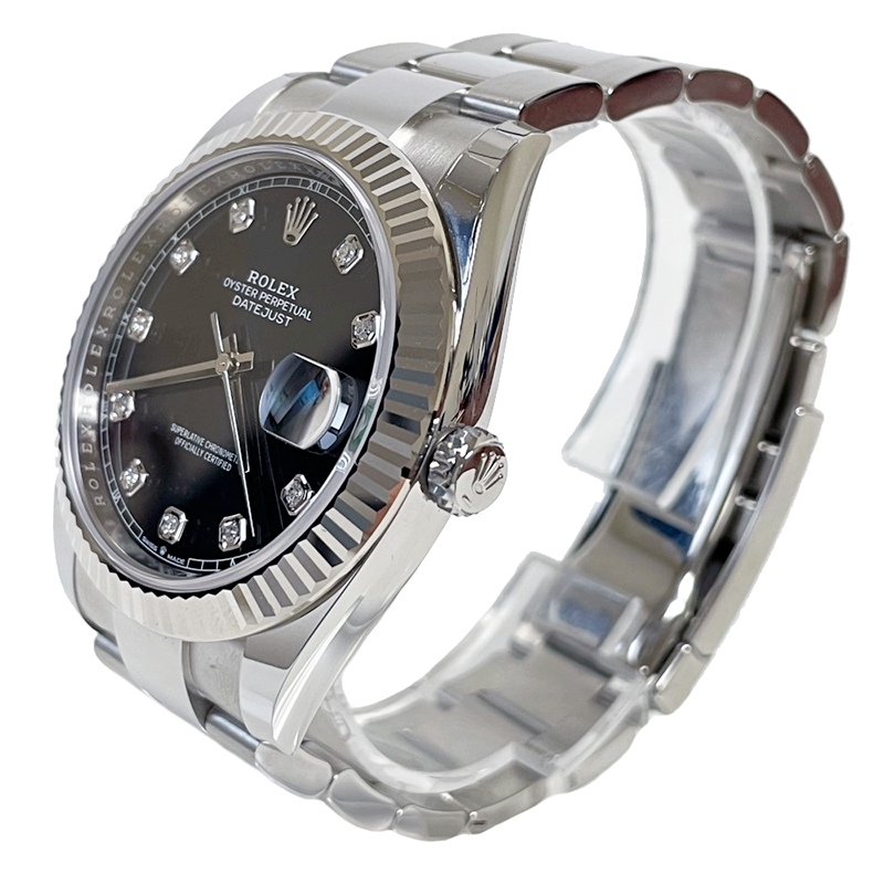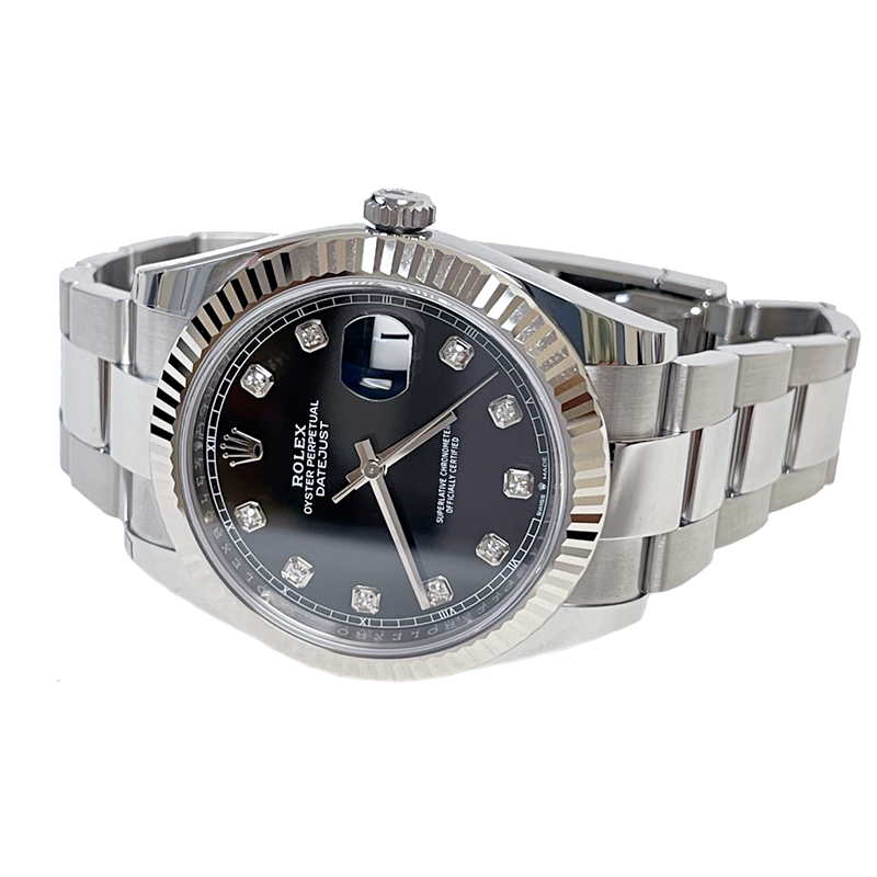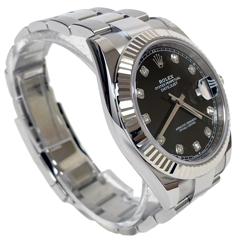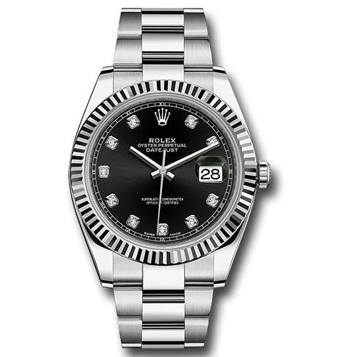 Rolex Oyster Perpetual Datejust Black Diamond Dial Mens Watch 126334BKDO. Silver-tone stainless steel case with a silver-tone stainless steel Rolex oyster bracelet. Fluted silver-tone 18k white gold bezel. Black dial with silver-tone hands and diamonds hour markers. Rolex Calibre 3235 automatic movement with a 70-hour power reserve. Scratch resistant sapphire crystal. Screw down crown. Case size: 41 mm. Round case shape. Water resistant at 100 meters / 330 feet. Functions: date, hour, minute, second.