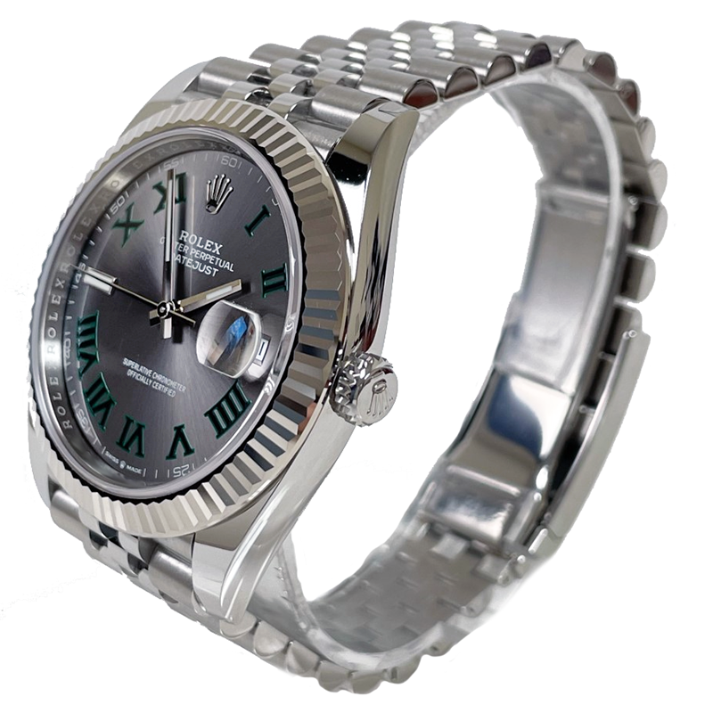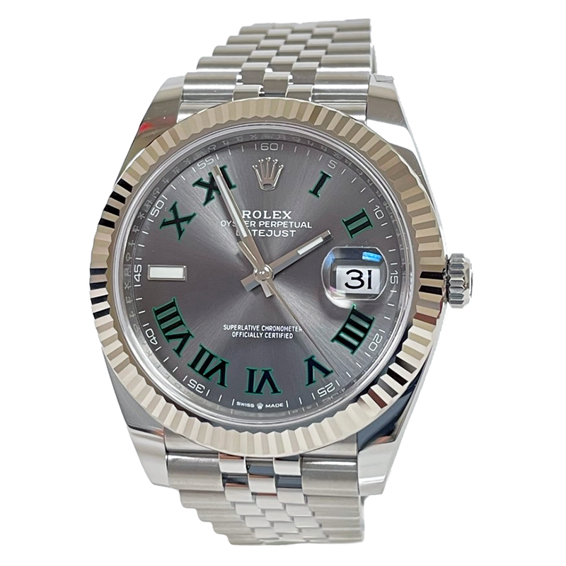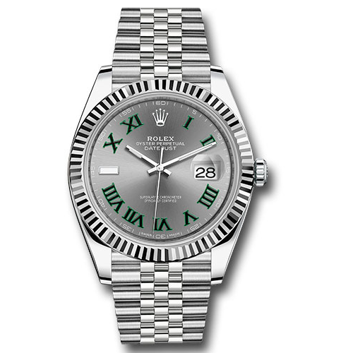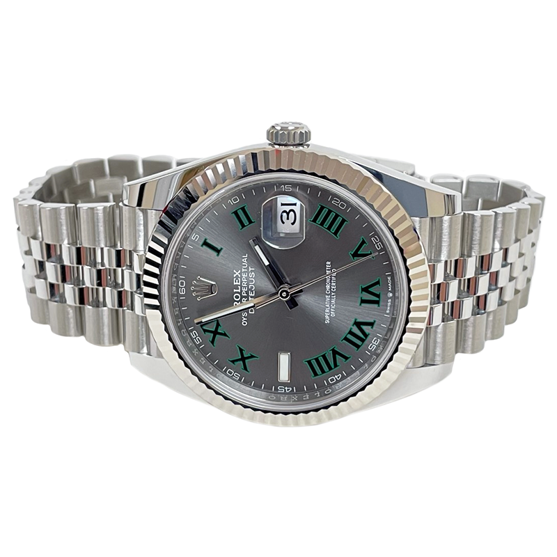 Rolex Datejust Black Diamond Dial Automatic Mens Jubilee Watch 126334 slgrj. 41mm white Rolesor case comprised of a 904L steel monobloc middle case, screw-down steel back, screw-down crown with twinlock double waterproofness system, 18K white gold fluted bezel, scratch-resistant double anti-reflective sapphire crystal with cyclops lens over the date, slate dial, Roman numerals, Rolex calibre 3235 perpetual self-winding movement with date at 3 o'clock that changes instantaneously at midnight in a few thousandths of a second, approximately 70 hours of power reserve, 904L steel Jubilee bracelet with five-piece links, folding Oysterclasp buckle with Easylink 5mm comfort extension link. Waterproof to 100 meters.