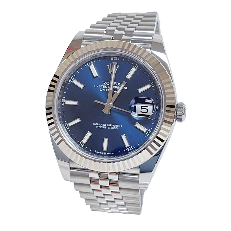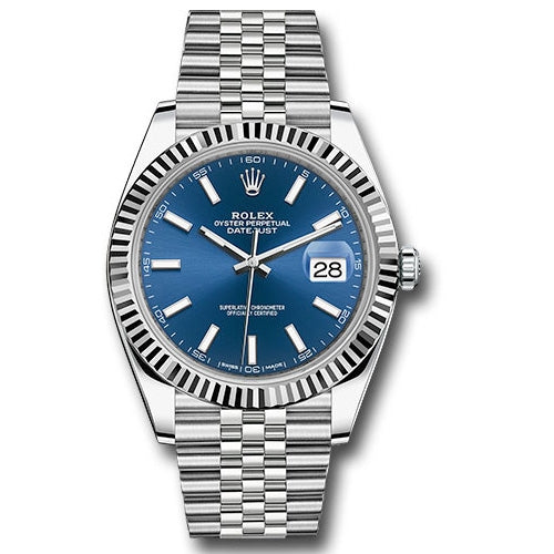 Rolex 126334BLIJ Oyster Perpetual Datejust 41mm Men's Watch. White Rolesor case comprised of a 904L steel monobloc middle case, screw-down steel back, screw-down crown with twinlock double waterproofness system, 18kt white gold fluted bezel, scratch-resistant double anti-reflective sapphire crystal with cyclops lens over the date, blue dial, index hour markers, Rolex calibre 3235 perpetual self-winding movement with date at 3 o'clock that changes instantaneously at midnight in a few thousandths of a second, approximately 70 hours of power reserve, 904L steel Jubilee bracelet with five-piece links, folding Oysterclasp buckle with Easylink 5mm comfort extension link. Waterproof to 100 meters.