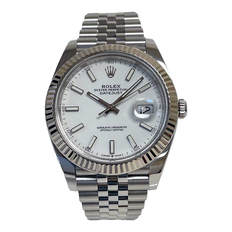 Rolex 126334 wij Datejust 41mm Men's Watch. White Rolesor case comprised of a 904L steel monobloc middle case, screw-down steel back, screw-down crown with twinlock double waterproofness system, 18kt white gold fluted bezel, scratch-resistant double anti-reflective sapphire crystal with cyclops lens over the date, white dial, index hour markers, Rolex calibre 3235 perpetual self-winding movement with date at 3 o'clock that changes instantaneously at midnight in a few thousandths of a second, approximately 70 hours of power reserve, 904L steel Jubilee bracelet with five-piece links, folding Oysterclasp buckle with Easylink 5mm comfort extension link. Waterproof to 100 meters.