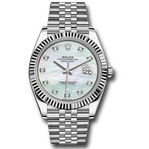 Rolex 126334WMDJ Oyster Perpetual Datejust 41mm Men's Watch. White Rolesor case comprised of a 904L steel monobloc middle case, screw-down steel back, screw-down crown with twinlock double waterproofness system, 18kt white gold fluted bezel, scratch-resistant double anti-reflective sapphire crystal with cyclops lens over the date, white mother-of-pearl dial, 10 diamond hour markers, Rolex calibre 3235 perpetual self-winding movement with date at 3 o'clock that changes instantaneously at midnight in a few thousandths of a second, approximately 70 hours of power reserve, 904L steel Jubilee bracelet with five-piece links, folding Oysterclasp buckle with Easylink 5mm comfort extension link. Waterproof to 100 meters.