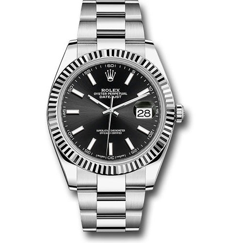 Rolex 126334 bkio Oyster Perpetual Datejust Men's Watch. 41mm white Rolesor case comprised of a 904L steel monobloc middle case, screw-down steel back, screw-down crown with twinlock double waterproofness system, 18kt white gold fluted bezel, scratch-resistant double anti-reflective sapphire crystal with cyclops lens over the date, black dial, index hour markers, Rolex calibre 3235 perpetual self-winding movement with date at 3 o'clock that changes instantaneously at midnight in a few thousandths of a second, approximately 70 hours of power reserve, 904L steel Oyster bracelet with flat three-piece links, folding Oysterclasp buckle with Easylink 5mm comfort extension link. Waterproof to 100 meters. Item Variation: 126334bkio