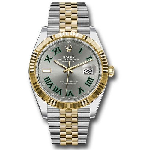 Rolex 126333 slgrj Oyster Perpetual Datejust 41 Watch. 41mm Yellow Rolesor case with 904L steel monobloc middle case, screw-down steel back, 18K yellow gold screw-down crown, 18K yellow gold fluted bezel, scratch-resistant double anti-reflective sapphire crystal with cyclops lens over the date, slate dial, green Roman numerals, Rolex calibre 3235 perpetual self-winding movement with date at 3 o'clock that changes instantaneously at midnight in a few thousandths of a second, approximately 70 hours of power reserve, yellow Rolesor Jubilee bracelet made from a combination of 904L steel and 18K yellow gold with five-piece links, folding Oysterclasp buckle with Easylink 5mm comfort extension link. Waterproof to 100 meters.