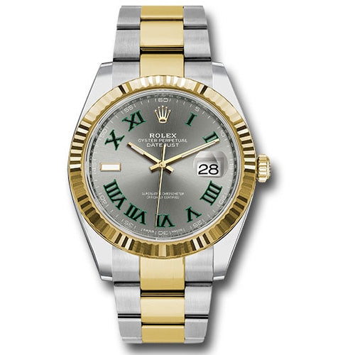 Rolex 126333 slgro Oyster Perpetual Datejust 41 Watch. 41mm Yellow Rolesor case with 904L steel monobloc middle case, screw-down steel back, 18K yellow gold screw-down crown, 18K yellow gold fluted bezel, scratch-resistant double anti-reflective sapphire crystal with cyclops lens over the date, slate dial, green Roman numerals, Rolex calibre 3235 perpetual self-winding movement with date at 3 o'clock that changes instantaneously at midnight in a few thousandths of a second, approximately 70 hours of power reserve, yellow Rolesor Oyster bracelet made from a combination of 904L steel and 18K yellow gold with flat three-piece links, folding Oysterclasp buckle with Easylink 5mm comfort extension link. Waterproof to 100 meters.