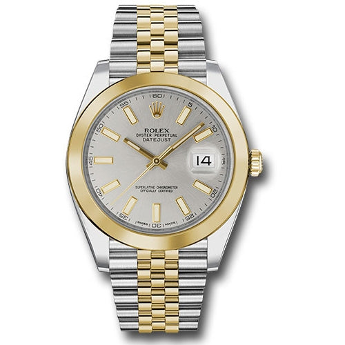 Rolex 126303 sij Oyster Perpetual Datejust 41 Watch. 41mm Yellow Rolesor case with 904L steel monobloc middle case, screw-down steel back, 18K yellow gold screw-down crown, 18K yellow gold smooth bezel, scratch-resistant double anti-reflective sapphire crystal with cyclops lens over the date, silver dial, index hour markers, Rolex calibre 3235 perpetual self-winding movement with date at 3 o'clock that changes instantaneously at midnight in a few thousandths of a second, approximately 70 hours of power reserve, yellow Rolesor Jubilee bracelet made from a combination of 904L steel and 18K yellow gold with five-piece links, folding Oysterclasp buckle with Easylink 5mm comfort extension link. Waterproof to 100 meters.