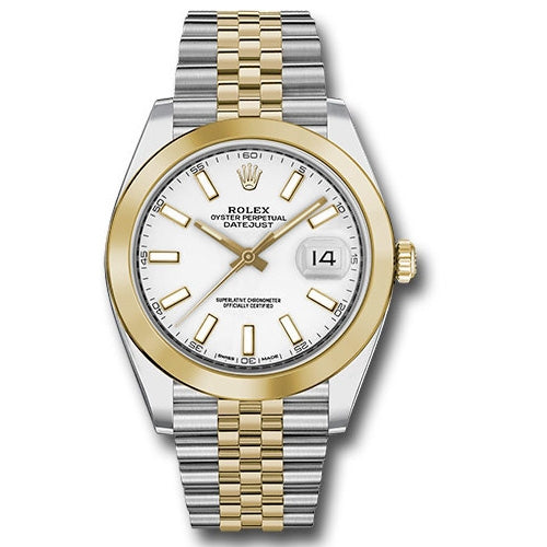 Rolex 126303 wij Oyster Perpetual Datejust 41 Watch. 41mm Yellow Rolesor case with 904L steel monobloc middle case, screw-down steel back, 18K yellow gold screw-down crown, 18K yellow gold smooth bezel, scratch-resistant double anti-reflective sapphire crystal with cyclops lens over the date, white dial, index hour markers, Rolex calibre 3235 perpetual self-winding movement with date at 3 o'clock that changes instantaneously at midnight in a few thousandths of a second, approximately 70 hours of power reserve, yellow Rolesor Jubilee bracelet made from a combination of 904L steel and 18K yellow gold with five-piece links, folding Oysterclasp buckle with Easylink 5mm comfort extension link. Waterproof to 100 meters.