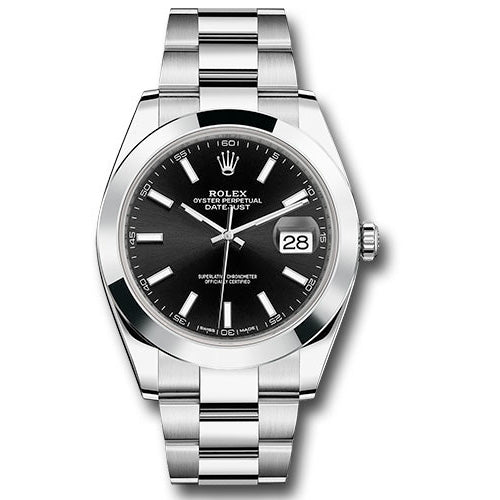 Rolex 126300BKIO Oyster Perpetual Datejust 41mm Men's Watch. 904L stainless steel case, screw-down steel back, screw-down crown with twinlock double waterproofness system, smooth bezel, scratch-resistant double anti-reflective sapphire crystal with cyclops lens over the date, black dial, index hour markers, Rolex calibre 3235 perpetual self-winding movement with date at 3 o'clock that changes instantaneously at midnight in a few thousandths of a second, approximately 70 hours of power reserve, 904L steel Oyster bracelet with flat three-piece links, folding Oysterclasp buckle with Easylink 5mm comfort extension link. Waterproof to 100 meters.
