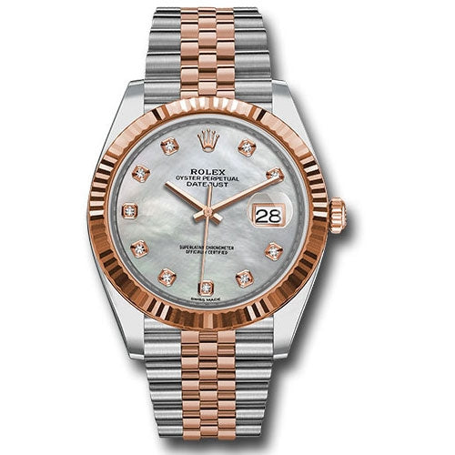 Rolex 126331 mdj Jubilee Datejust 41mm Steel & Rose Gold Mens Watch. 41mm Everose Rolesor case with 904L steel monobloc middle case, screw-down steel back, 18K Everose gold screw-down crown, 18K Everose gold fluted bezel, scratch-resistant double anti-reflective sapphire crystal with cyclops lens over the date, mother of pearl dial, 10 diamond hour markers, Rolex calibre 3235 perpetual self-winding movement with date at 3 o'clock that changes instantaneously at midnight in a few thousandths of a second, approximately 70 hours of power reserve, Everose Rolesor Jubilee bracelet made from a combination of 904L steel and 18K Everose gold with five-piece links, folding Oysterclasp buckle with Easylink 5mm comfort extension link. Waterproof to 100 meters.
