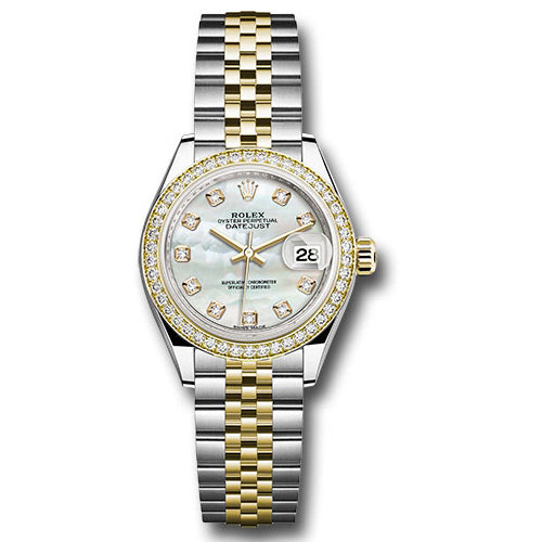 Rolex 279383RBR mdj Ladies 28mm Steel & Yellow Gold Watch. 18K yellow gold screw-down crown with twinlock double waterproofness system, 18K yellow gold diamond bezel, scratch-resistant sapphire crystal with cyclops lens over the date and double anti-reflective coating, white mother-of-pearl dial, diamond hour markers, Rolex calibre 2236 automatic movement with center hour, minute and seconds hands, instantaneous date with rapid setting, and stop-seconds for precise time setting, yellow gold Rolesor Jubilee bracelet comprised of a combination of 904L steel and 18K yellow gold in five-piece links, concealed folding Crownclasp buckle.