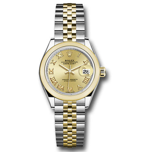 Rolex 279163 chrj Ladies 28mm Watch. 18K yellow gold screw-down crown with twinlock double waterproofness system, 18K yellow gold domed bezel, scratch-resistant sapphire crystal with cyclops lens over the date and double anti-reflective coating, champagne dial, Roman numerals, Rolex calibre 2236 automatic movement with center hour, minute and seconds hands, instantaneous date with rapid setting, and stop-seconds for precise time setting, yellow gold Rolesor Jubilee bracelet comprised of a combination of 904L steel and 18K yellow gold in five-piece links, concealed folding Crownclasp buckle.