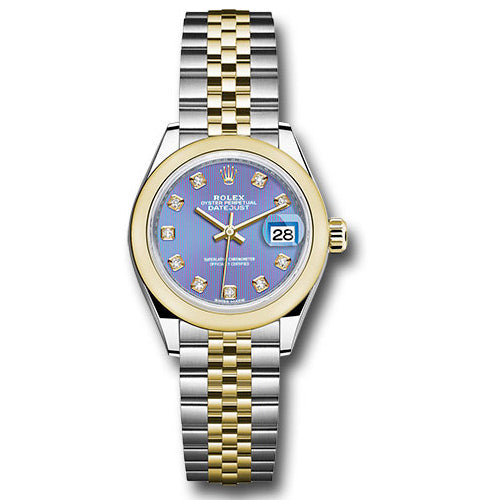 Rolex 279163 ldj Ladies 28mm Watch. 18K yellow gold screw-down crown with twinlock double waterproofness system, 18K yellow gold domed bezel, scratch-resistant sapphire crystal with cyclops lens over the date and double anti-reflective coating, lavender dial, diamond hour markers, Rolex calibre 2236 automatic movement with center hour, minute and seconds hands, instantaneous date with rapid setting, and stop-seconds for precise time setting, yellow gold Rolesor Jubilee bracelet comprised of a combination of 904L steel and 18K yellow gold in five-piece links, concealed folding Crownclasp buckle.