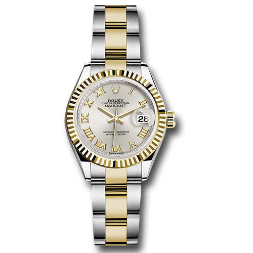 Rolex 279173 sro Lady 28 Steel and Yellow Gold Watch. 18K yellow gold screw-down crown with twinlock double waterproofness system, 18K yellow gold fluted bezel, scratch-resistant sapphire crystal with cyclops lens over the date and double anti-reflective coating, silver dial, Roman numerals, Rolex calibre 2236 automatic movement with center hour, minute and seconds hands, instantaneous date with rapid setting, and stop-seconds for precise time setting, yellow gold Rolesor Oyster bracelet comprised of a combination of 904L steel and 18K yellow gold in flat three-piece links, folding Oysterclasp buckle