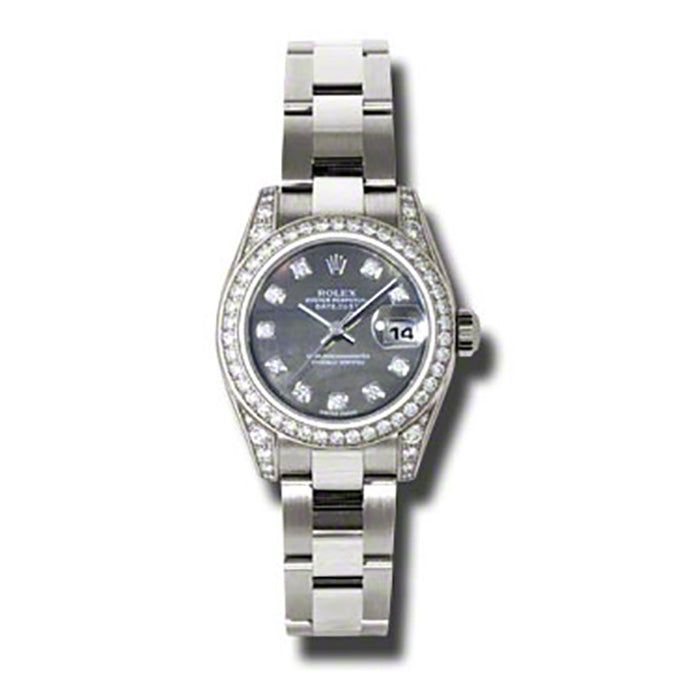 Rolex 179159dkmdo Oyster Perpetual Lady-Datejust Watch. 26mm 18kt white gold case, case lugs set with 24 diamonds, bezel set with 42 diamonds, dark mother of pearl dial, diamond hour markers, and Oyster bracelet.