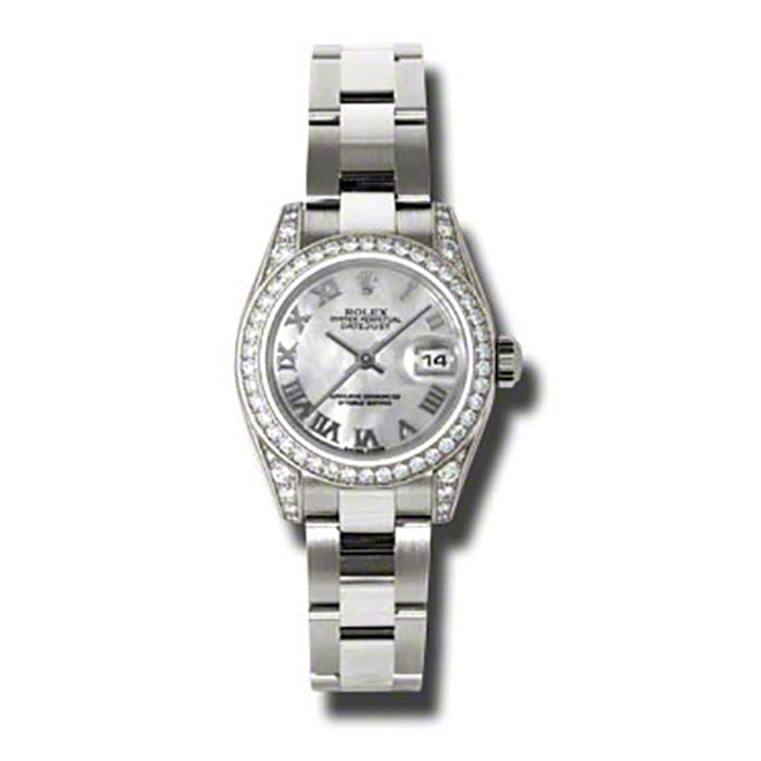 Rolex Lady Datejust Mother of Pearl Roman Dial 18kt White Gold Diamond Case and Bezel Oyster Bracelet Watch 179159MRO. 18kt white gold diamond case with a 18k white gold oyster bracelet. Diamonds and 18k white gold bezel. Mother of pearl dial with silver tone hands and Roman numeral hour markers. Self-winding movement. Scratch resistant sapphire crystal. Screw down crown. Solid case back. Case diameter: 26 mm. Round case shape. Oysterlock clasp. Water resistant at 100 meters/ 330 feet. Functions: hours, minutes, seconds, date.