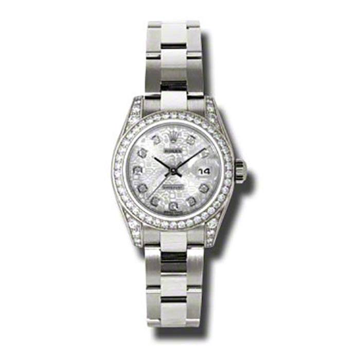 Rolex Lady Datejust Silver Jubilee Diamond Dial 18k White Gold Diamond Case and Bezel Oyster Bracelet Watch 179159SJDO. 18kt white gold diamond case with a 18k white gold oyster bracelet. Diamonds and 18k white gold bezel. Silver jubilee dial with silver tone hands and diamond hour markers. Date displays at the 3 o'clock position. Self-winding movement. Scratch resistant sapphire crystal. Case diameter: 26 mm. Water resistant at 100 meters/ 330 feet. Functions: hours, minutes, seconds, date.