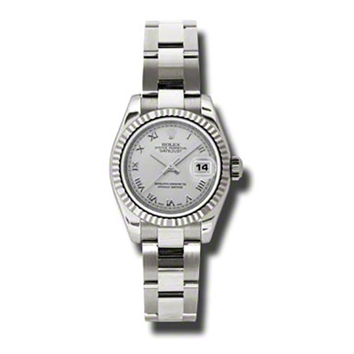 Rolex 179179SRO Oyster Perpetual Lady-Datejust Watch. 26mm 18kt white gold case, fluted bezel, silver dial, Roman numerals, and Oyster bracelet.