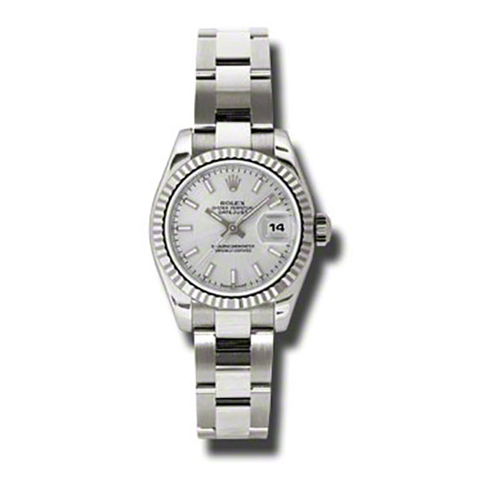 Rolex 179179SSO Oyster Perpetual Lady-Datejust Watch. 26mm 18kt white gold case, fluted bezel, silver dial, index hour markers, and Oyster bracelet.